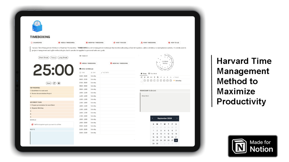 TIMEBOXING is among the most well-studied and powerful methods for getting things done. A brilliant technique both used by Elon Musk and Bill Gates, which entails boxing out periods of time to work on distinct tasks each day. This template allows you to seamlessly adapt this Harvard method into your everyday life with Notion.