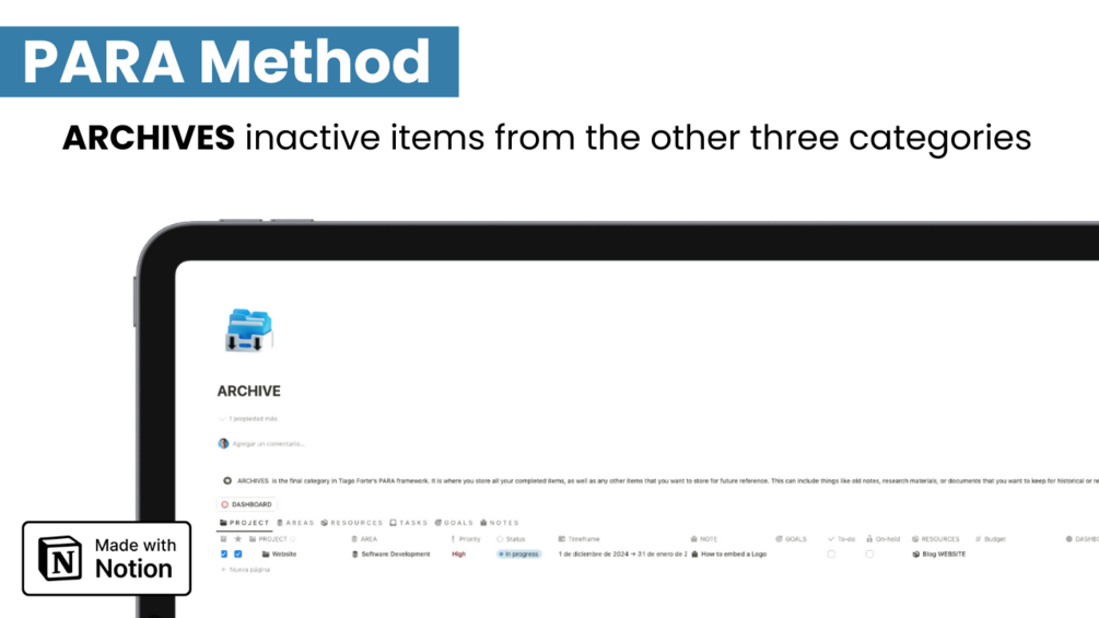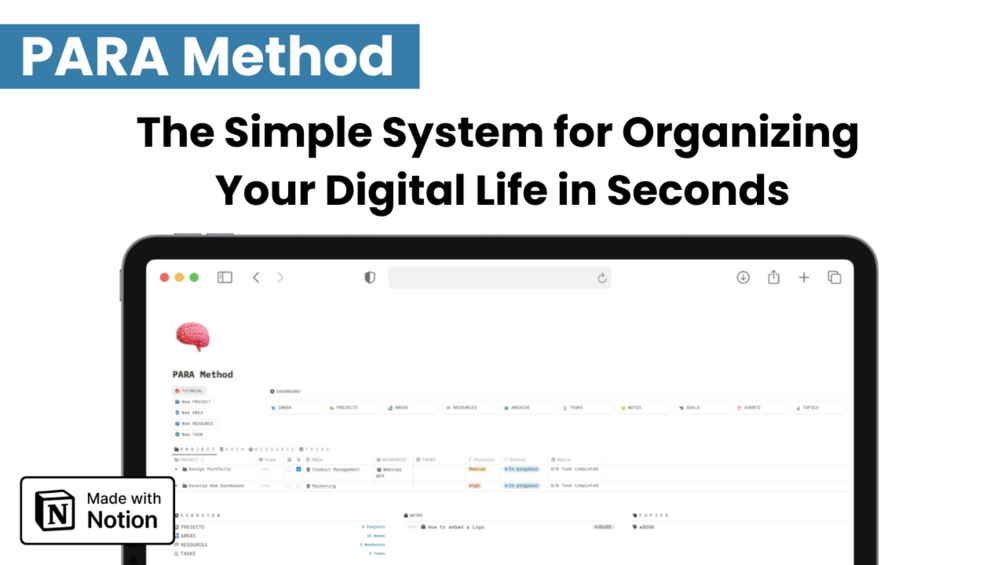 PARA Method helps you organize everything in one user-friendly system. Manage your Projects, Tasks, Resources, Notes, Events and Goals.