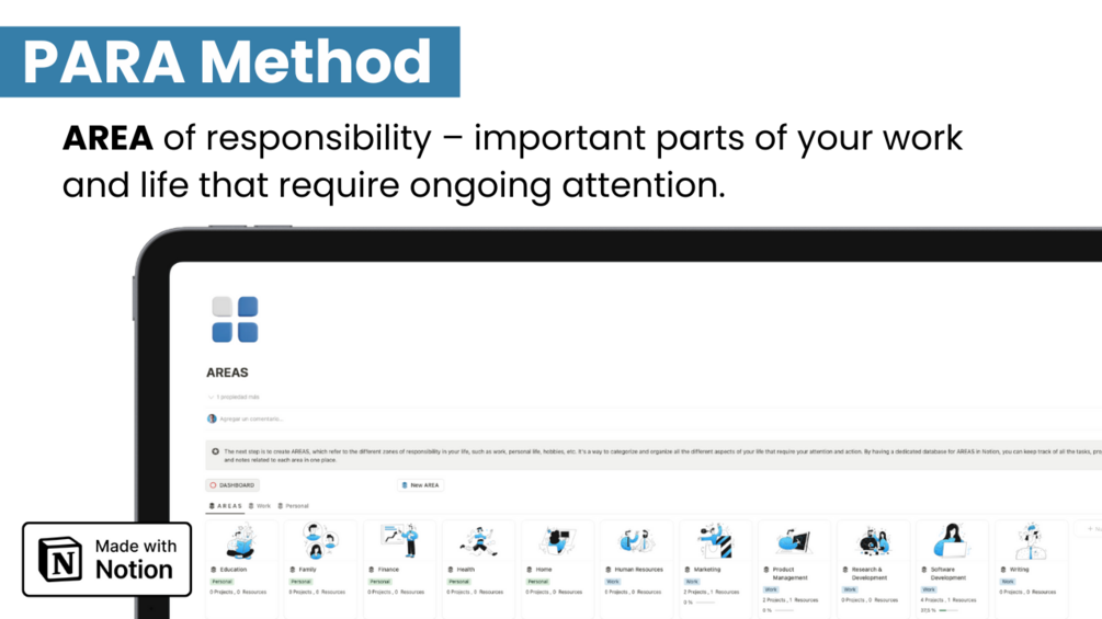 You can view and organize all of your Tasks, Projects, Areas and Resources inside Notion using the PARA method.