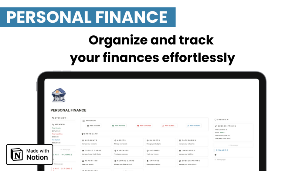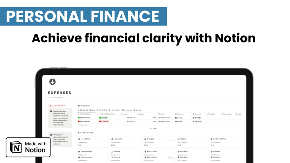 Transform your financial management with the Notion Personal Finance template – an all-in-one solution designed to bring clarity, control, and efficiency to your finances. Whether you're tracking expenses, managing budgets, or planning for future goals, this template has you covered with comprehensive databases and easy-to-use features.