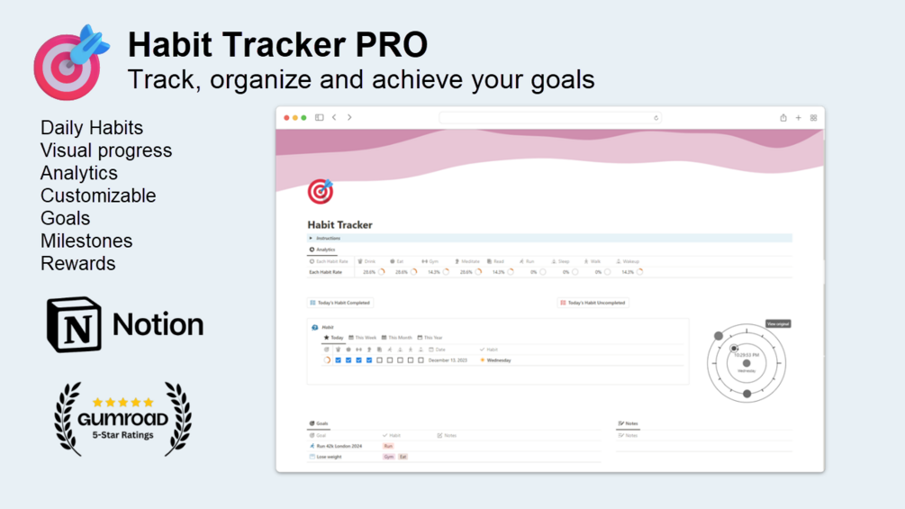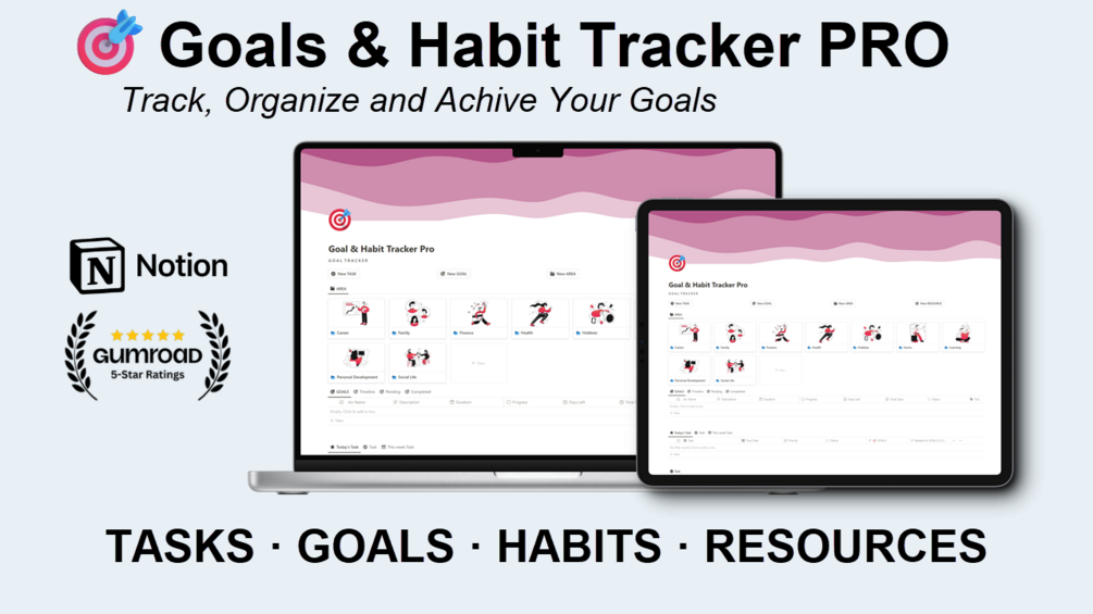 The Notion Goal Tracker Pro is a comprehensive system within the Notion app that allows users to define, organize, and monitor their objectives, tasks, habits, and progress. It provides a centralized platform for setting and managing short-term and long-term goals, breaking them down into actionable tasks, and tracking overall progress. The flexibility and customization options in Notion make it an ideal platform for creating personalized and dynamic goal tracking systems.